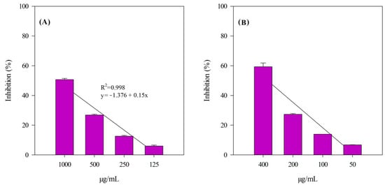 PIA was determined as described by Ingegneri et al. [17]. Briefly, 200 µL of BPE (50–400 µg/mL) or diclofenac sodium (5–80 µg/mL) was mixed with 12 µL of trypsin (10 µg/mL), 188 µL of Tris-HCl buffer (20 mM, pH 7.5), and 200 µL of casein solution (0.8%). The mixture was incubated at 37 °C for 20 min. The enzymatic reaction was terminated by adding 400 µL of 2 M perchloric acid, followed by centrifugation at 3500× g for 10 min. The absorbance of the resulting supernatant was measured at 280 nm using the spectrophotometer described in Section 2.6.2.