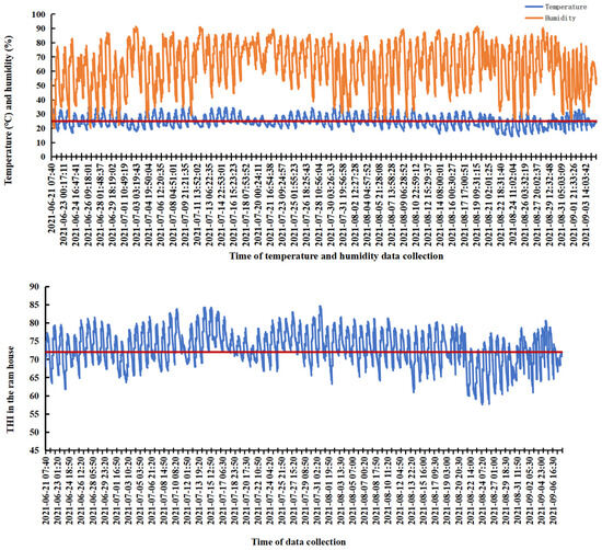 The temperature and humidity data were recorded at 10 min intervals using a 4G wireless temperature and humidity recorder (TH40 G4-EX, Shenzhen Huahanwei, Shenzhen, China), which was suspended 1.5 m above the ground. Thereafter, the temperature and humidity index (THI) was calculated according to the following formula presented in Reference [33]:
