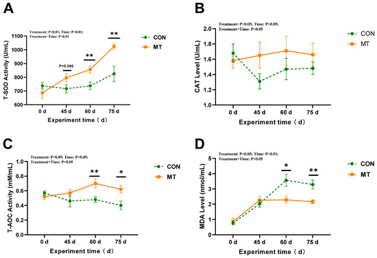 Melatonin implantation significantly affected (p < 0.05) serum T-SOD activity and MDA content throughout the experimental period from day 0 to day 75 (Figure 3A,D). Compared with the CON group, the MT group exhibited a marked increase in serum T-SOD activity (p < 0.05) and a notable decrease in MDA content (p < 0.05). Days had a highly significant impact on T-AOC and MDA levels (p < 0.01) (Figure 3C,D). Specifically, on day 45, the T-SOD activity in the MT group was significantly elevated compared to that in the CON group (p < 0.05), whereas on day 60, the MDA content in the MT group was significantly lower than that in the CON group (p < 0.05). Melatonin implantation did not significantly affect CAT activity in serum (p > 0.05) (Figure 3B).