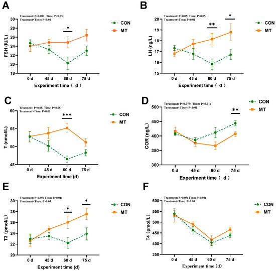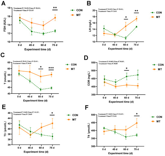 The results demonstrated that slow-release melatonin significantly affected serum FSH and T3 concentration (p < 0.05) (Figure 5A,E), and exerted a highly significant impact on serum T concentration (p < 0.01) (Figure 5C). The cortisol concentration in the MT group was higher than that in the CON group at day 60 (p < 0.05) (Figure 5D). No significant effects were observed on other serum endocrine hormones (p > 0.05). Significant time-related effects were noted for serum concentrations of FSH, T, and LH (p < 0.01) (Figure 5A–C), as well as a significant time-related effect on T4 concentration (p < 0.05) (Figure 5F). The concentrations of FSH, LH, and T in the control group exhibited a significant decrease during days 0 to 60. Significant interactions between melatonin and treatment time were observed in the concentrations of LH and T4 (p < 0.01) (Figure 5B,F) and FSH and T3 (p < 0.05) (Figure 5A,E). By day 75, the MT group exhibited significantly elevated levels of FSH, LH, and T compared to the CON group (p < 0.01).