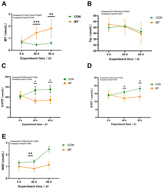 Impact of melatonin on the key tryptophan metabolites involved in melatonin biosynthesis in the serum of rams (n = 7) during the summer season. (A) Melatonin (MT). (B) L-tryptophan (Trp). (C) L-5-Hydroxytryptophan (5-HTP). (D) Serotonin (5-HT). (E) N-Acetyl-5-hydroxytryptamine (NAS). The solid yellow line indicates the MT group; the broken green line indicates the CON group. The data are expressed as mean ± SEM. The significant differences were assessed using repeated measures analysis. * p < 0.05, ** p < 0.01, and *** p < 0.001 between groups on that day.