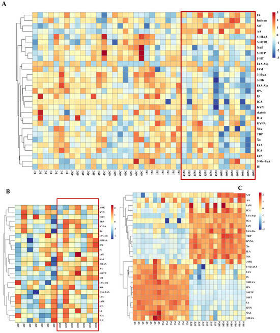 Heatmap of the key tryptophan metabolites in serum and seminal plasma of rams (n = 7). (A) Heatmap of the key tryptophan metabolites in serum at days 1, 45, and 60; (B) heatmap of the key tryptophan metabolites in seminal plasma at day 60; and (C) heatmap for comparison of common tryptophan metabolites in serum (SC and SM) and seminal plasma (SPC and SPM) at day 60. The labels 1 C, 45 C, and 60 C, and 1 M, 45 M, and 60 M represent the data of the control group and the treatment group at days 1, 45, and 60, respectively. SC, SM and SPC, SPM mean the control group and the treatment group in serum and seminal plasma at day 60, respectively. The red box section represents the treatment groups. All the abbreviations of tryptophan metabolites are presented as follows: L-tryptophan (Trp), L-5-Hydroxytryptophan (5-HTP), Serotonin (5-HT), N-Acetyl-5-hydroxytryptamine (NAS), Melatonin (MT), Kynurenine (KYN), Kynurenic acid (KYNA), 3-Hydroxyanthranilic acid (3-HAA), 3-Hydroxykynurenine (3-HK), Indole-3-acetic acid (IAA), 5-Hydroxyindoleacetic acid (5-HIAA), 5-Hydroxytryptophol (5-HTOL), Xanthurenic acid (Xa), 5-Methoxy-3-indoleacetic acid (5-Me-IAA), Anthranilic acid (AA), Nicotinic acid (NiA), Indole acrylic acid (IA), Indole-3-acetamide(IAM), Indole-3-carboxaldehyde (ICA), Indole ethanol/tryptophol (IE), 3-Indoleglyoxylic acid (IGA), Indolelactic acid (ILA), 3-Indolepropionic acid (IPA), Indoxylsulfate (IS), Indole-3-acetonitrile (IAN), Indole-3-acetyl-alanine (IAA-Ala), and Indole-3-acetyl-aspartate (IAA-Asp).
