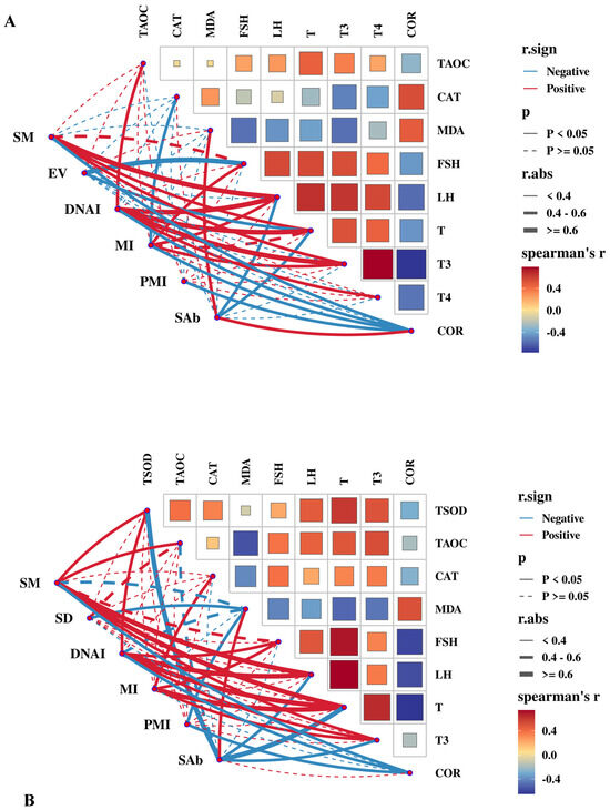 Figure 10B shows that T-SOD activity in seminal plasma was positively moderately correlated with SM and DNAI (0.4 < r < 0.6, p < 0.05) and negatively strongly correlated with SAb (r > 0.6, p < 0.01). T-AOC in seminal plasma was positively correlated with SM (0.4 < r < 0.6, p < 0.05). T concentration (r > 0.6, p < 0.01) and T3 concentration (0.4 < r < 0.6, p < 0.05) in seminal plasma were significantly positively correlated with SM, DNAI, and MI and significantly negatively correlated with SAb. The LH concentration in seminal plasma was also significantly positively strongly correlated with SM and DNAI (r > 0.6, p < 0.01) and negatively correlated with SAb (0.4 < r < 0.6, p < 0.05). The MDA concentration was positively correlated with SAb (0.4 < r < 0.6, p < 0.05) and negatively correlated with SD and PMI (0.4 < r < 0.6, p < 0.05). The COR concentration in seminal plasma was moderately negatively correlated with SM, DNAI, and PMI (0.4 < r < 0.6, p < 0.05).