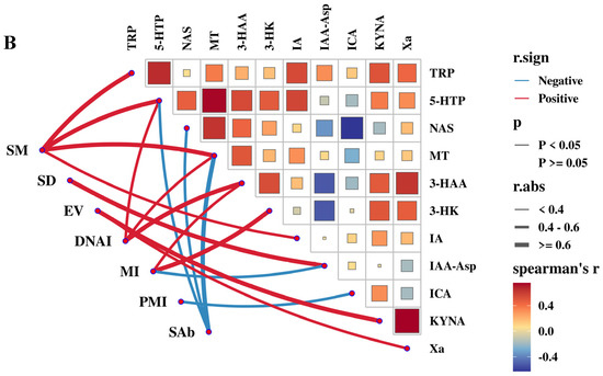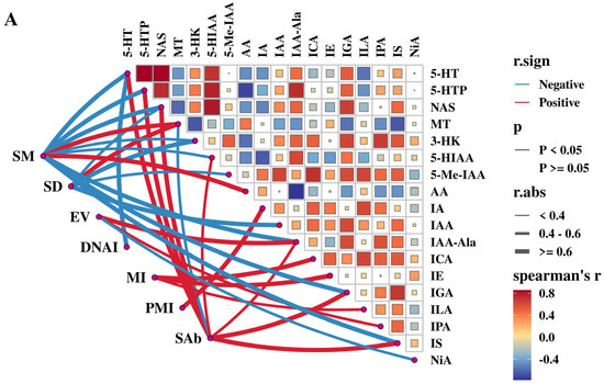Figure 11A illustrates the advanced correlation between semen quality indices and serum tryptophan metabolites. The concentrations of 5-HTP, 5-HT, and NAS were significantly positively strongly correlated with SAb (r > 0.6, p < 0.01), while they were negatively strongly correlated with SM (r > 0.6, p < 0.01). MT concentration was significantly positively strongly correlated with both SM and SD (r > 0.6, p < 0.01). Serum Anthranilic acid (AA) concentration was significantly positively correlated with SM (r > 0.6, p < 0.01). Indole-3-carboxaldehyde (ICA) and Indole-3-ethanol (IE) concentrations were positively correlated with MI (r > 0.6, p < 0.01). The Indole-3-glycerol (IGA) and Indole-3-sulfonic acid (IS) concentrations were negatively correlated with SM and positively correlated with SAb (r > 0.6, p < 0.01). The Indole-3-acetic acid (IA) and IAA-Ala concentrations were significantly positively correlated with PMI and EV (r > 0.6, p < 0.01), respectively.