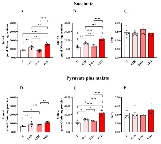 Oxygen consumption in homogenates of Artemia franciscana nauplii hatched in the absence (C) and presence of E120, E124 and VEG red food dyes. State 3 (in the presence of ADP; Panels (B,E)), State 4 (in the absence of ADP; Panels (A,D)) and RCR (Panels (C,F)) oxygen consumption is detected in presence of succinate (Panels (A,B)) and pyruvate/malate (Panels (D,E))-supplemented homogenates. Values are means ± SEMs of six (n = 6) biological replicates. The p-values of * p < 0.05, ** p < 0.01, *** p < 0.001 and **** p < 0.0001 were assigned to indicate statistical significance between the different experimental groups.
