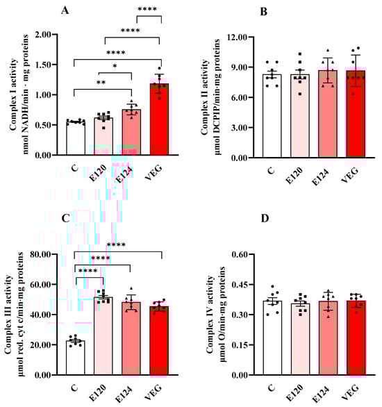 Complex I (Panel (A)), Complex II (Panel (B)), Complex III (Panel (C)) and Complex IV (or cytochrome oxidase, COX, Panel (D)) activities in homogenates of Artemia franciscana nauplii hatched in the presence of E120, E124 and Vegan red food dyes. Values are means ± SEMs of eight (n = 8) biological replicates. The p-values of * p < 0.05, ** p < 0.01 and **** p < 0.0001 were assigned to indicate statistical significance between the different experimental groups.