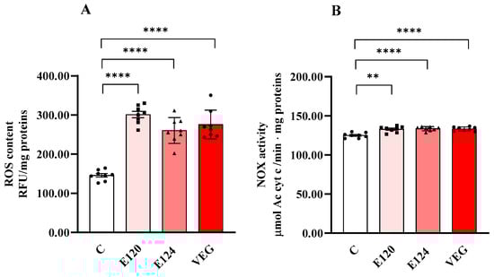 ROS content (Panel (A)) and NADPH oxidase (NOX) (Panel (B)) activity in homogenates of Artemia franciscana nauplii hatched in the presence of E120, E124 and Vegan red food dyes. Values are means ± SEM of eight (n = 8) biological replicates. The p-values of ** p < 0.01 and **** p < 0.0001 were assigned to indicate statistical significance between the different experimental groups.