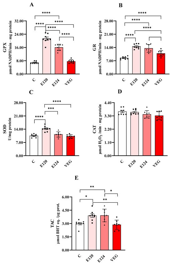 Glutathione peroxidase (GPX, Panel (A)), glutathione reductase (GR, Panel (B)), catalase (CAT, Panel (C)) and superoxide dismutase (SOD, panel (D)) activities and total antioxidant capacity (TAC, Panel (E)) in homogenates of Artemia franciscana nauplii hatched in presence of E120, E124 and Vegan red food dyes. Values are means ± SEMs of eight (n = 8) biological replicates. The p-values of * p < 0.05, ** p < 0.01, *** p < 0.001 and **** p < 0.0001 were assigned to indicate statistical significance between the different experimental groups.
