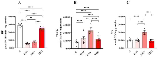 Hydroperoxide (HP; Panel (A)), Thiobarbituric Acid Reactive Substance (TBAR; Panel (B)) and protein-bound carbonyl content (CO; Panel (C)) in homogenates of Artemia franciscana nauplii hatched in the presence of E120, E124 and Vegan red food dyes. Values are means ± SEMs of eight (n = 8) biological replicates. The p-values of ** p < 0.01 and **** p < 0.0001 were assigned to indicate statistical significance between the different experimental groups.