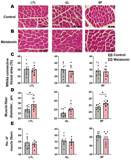 H&E staining of muscle sections revealed an elevation (p < 0.05) in muscle fiber diameter within the LTL and BF following melatonin treatment (Figure 1A,B). Concomitant reductions in connective tissue area and muscle fiber number were observed across these muscles, though these trends did not reach statistical significance (Figure 1C–E).