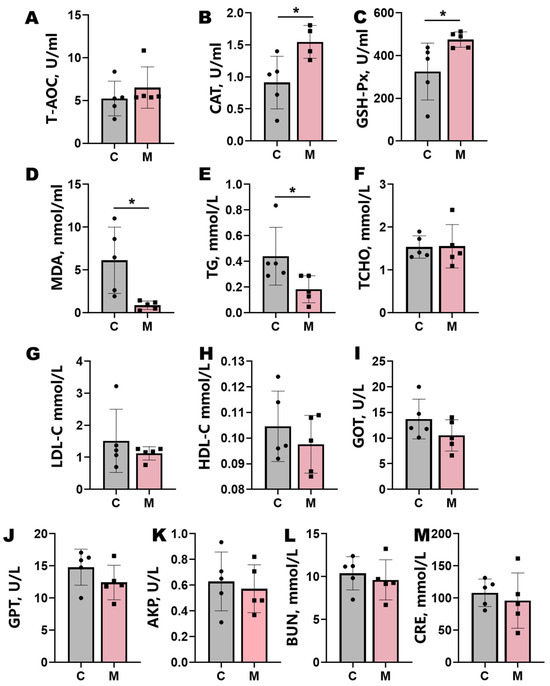 Blood biochemical parameters in control (C) and melatonin-treated (M) groups. (A–D) Antioxidant indices: total antioxidant capacity (T-AOC), catalase (CAT), glutathione peroxidase (GSH-Px), and malondialdehyde (MDA). (E–H) Lipid metabolism markers: triglyceride (TG), total cholesterol (TCHO), low-density lipoprotein cholesterol (LDL-C), and high-density lipoprotein cholesterol (HDL-C). (I–M) Liver and kidney function parameters: blood urea nitrogen (BUN), creatinine (CRE), glutamic oxaloacetic transaminase (GOT), glutamic pyruvic transaminase (GPT), and alkaline phosphatase (AKP). Data represent mean ± SD (n = 5); statistical significance (t-test): p < 0.05 and * p < 0.01.