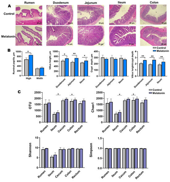 Gastrointestinal histology and microbial diversity control vs. melatonin-treated groups at slaughter. (A) Representative H&E-stained sections (scale bar = 50 µm) of rumen, duodenum, jejunum, ileum, and colon. (B) Villus height and crypt depth (statistical analysis). (C) Alpha diversity indices (OTUs, Chao1, Shannon, and Simpson) of microbial communities in rumen fluid, ileal, cecal, colonic, and rectal content. * p < 0.01 and ** p < 0.001.
