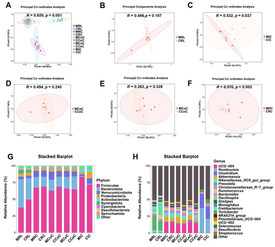 Beta diversity analysis and taxonomic composition of gastrointestinal microbiota in control and melatonin-group Liaoning cashmere goats. (A–F) PCoA of microbial communities (Bray-Curtis distances) in rumen fluid (B), ileal (C), cecal (D), colonic (E), and rectal (F) content. (G,H) Bacterial community structure at the (G) phylum and (H) genus levels.