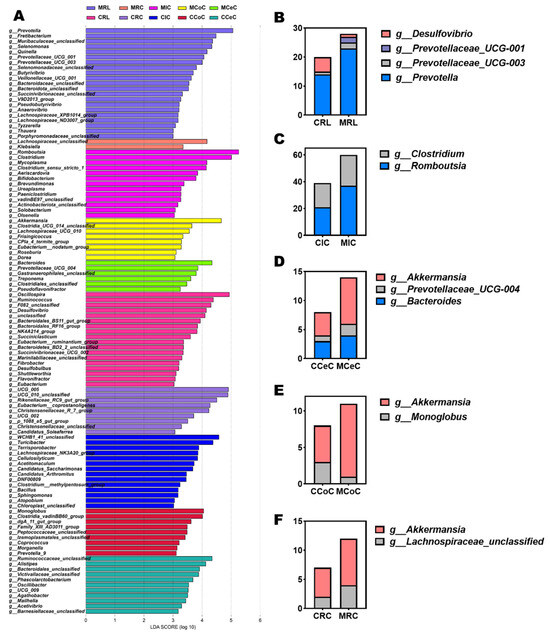 Differentially abundant microbial genera and LEfSe analysis of gastrointestinal microbiota in melatonin-treated Liaoning cashmere goats. (A) LEfSe analysis identifying genus-level differentially abundant taxa (LDA score > 3, p < 0.05) across gastrointestinal regions. (B–F) Group-specific, significantly differentially abundant genera in rumen fluid, ileal, cecal, colonic, and rectal digesta between control and melatonin-treated groups.