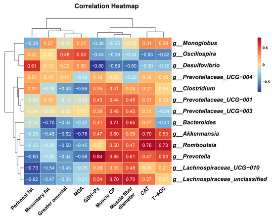 Beneficial taxa included the following: g__Prevotella demonstrated strong positive correlations with muscle CP (R = 0.648, p = 0.049), muscle fiber diameter (R = 0.612, p = 0.056), and GSH-PX activity (R = 0.839, p = 0.002). g__Romboutsia correlated positively with CAT activity (R = 0.758, p = 0.016) and T-AOC (R = 0.730, p = 0.017). g__Akkermansia showed inverse associations with MDA levels (R = −0.782, p = 0.012) and greater omental fat deposition (R = −0.624, p = 0.050), alongside positive correlations with CAT activity (R = 0.697, p = 0.031). g__Lachnospiraceae_UCG-010 and g__Lachnospiraceae_unclassified were inversely linked to perirenal fat (R = −0.733, p = 0.021) and positively associated with muscle CP (R = 0.697, p = 0.031) and muscle fiber diameter (R = 0.697, p = 0.031). Adverse taxa included the following: g__Desulfovibrio displayed negative correlations with GSH-PX activity (R = −0.796, p = 0.006), muscle CP (R = −0.588, p = 0.080), and muscle fiber diameter (R = −0.600, p = 0.073), while showing positive trends with perirenal fat accumulation (R = 0.612, p = 0.066) (Figure 6).