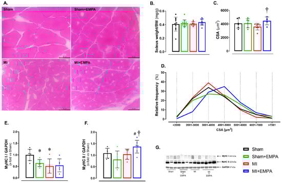 Effects of SGLT2 inhibition on the soleus structural parameters. (A) Representative haematoxylin and eosin-stained histological sections. Bar: 50 µm; (B) soleus weight-to-body weight (BW) ratio; (C) cross-sectional area (CSA); (D) Frequency of the fibres according to CSA; (E,F) Type I and II myosin heavy chain (MyHC) isoforms; (G) Western blot representative blots of MyHC isoforms. Sham: control group (n = 5); Sham + EMPA: Sham treated with empagliflozin (EMPA; n = 6); MI: myocardial infarction (n = 7); MI + EMPA: MI treated with EMPA (n = 7). Data are means ± SD and individual values or relative frequency; ANOVA for a 2 × 2 factorial design and Tukey; p < 0.05: * vs. Sham; # vs. Sham + EMPA; † vs. MI.