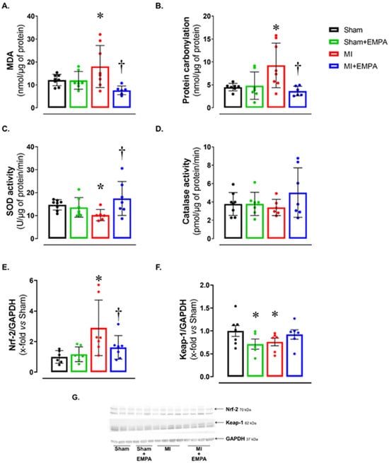 Soleus muscle oxidative stress. (A,B) Concentration of oxidative stress markers malondialdehyde (MDA) and protein carbonylation; (C,D) maximum activity of antioxidant superoxide dismutase and catalase; (E,F) expression of nuclear factor erythroid 2-related factor 2 (Nrf-2) and Kelch-like ECH-associated protein 1 (Keap-1) evaluated by Western blot; (G) representative Western blots of Keap-1, Nrf-2, and GAPDH. Sham: control group (n = 5); Sham + EMPA: Sham treated with empagliflozin (EMPA; n = 6); MI: myocardial infarction (n = 7); MI + EMPA: MI treated with EMPA (n = 7). Data are the means ± SD and individual values; ANOVA for a 2 × 2 factorial design and Tukey; p < 0.05: * vs. Sham; † vs. MI.