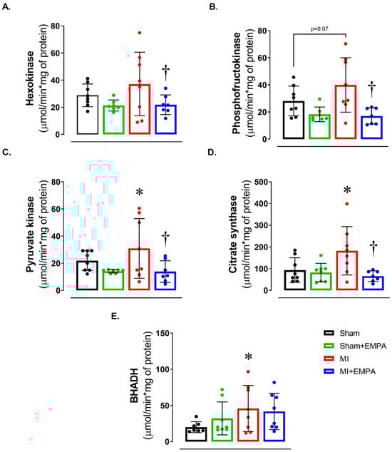 Muscle energy metabolism. (A–C) Maximum activity of glycolysis pathway enzymes; (D) maximum activity of the citric acid cycle enzyme, citrate synthase; (E) maximum activity of beta-oxidation pathway enzyme, beta-hydroxyacyl dehydrogenase (BHADH). Sham: control group (n = 5); Sham + EMPA: Sham treated with empagliflozin (EMPA; n = 6); MI: myocardial infarction (n = 7); MI + EMPA: MI treated with EMPA (n = 7). Data are the means ± SD and individual values; ANOVA for a 2 × 2 factorial design and Tukey; p < 0.05: * vs. Sham; † vs. MI.