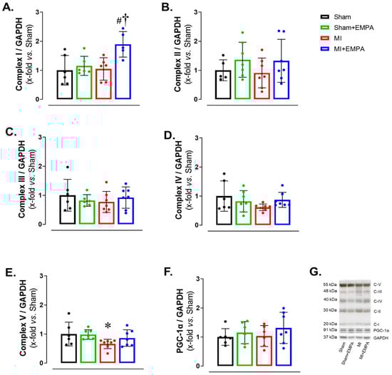 Mitochondrial respiratory complex expressions evaluated by Western blot. (A–E) Protein expression of oxidative phosphorylation complexes; (F) protein expression of peroxisomal proliferators-activated receptor γ-coactivator-1α (PGC-1α); (G) representative gels. Sham: control group (n = 5); Sham + EMPA: Sham treated with empagliflozin (EMPA; n = 6); MI: myocardial infarction (n = 7); MI + EMPA: MI treated with EMPA (n = 7). Data are the means ± SD and individual values; ANOVA for a 2 × 2 factorial design and Tukey; p < 0.05: * vs. Sham; # vs. Sham + EMPA; † vs. MI.