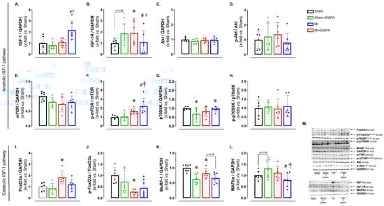 Protein expression evaluated by Western blot. (A–H) Protein expression of the anabolic IGF-1 pathway; (I–L) protein expression of the catabolic IGF-1 pathway; (M) representative blots. IGF-1: insulin-like growth factor Type 1; IGF-1R: IGF-1 receptor; Akt: protein kinase B; mTOR: mammalian target of rapamycin; p70S6K: ribosomal protein S6 kinase beta-1; FoxO3: forkhead box O3; MuRF-1: muscle RING-finger protein-1; MAFbx: muscle atrophy F-box. Sham: control group (n = 5); Sham + EMPA: Sham treated with empagliflozin (EMPA; n = 6); MI: myocardial infarction (n = 7); MI + EMPA: MI treated with EMPA (n = 7). Data are the means ± SD and individual values; ANOVA for a 2 × 2 factorial design and Tukey; p < 0.05: * vs. Sham; # vs. Sham + EMPA; † vs. MI.
