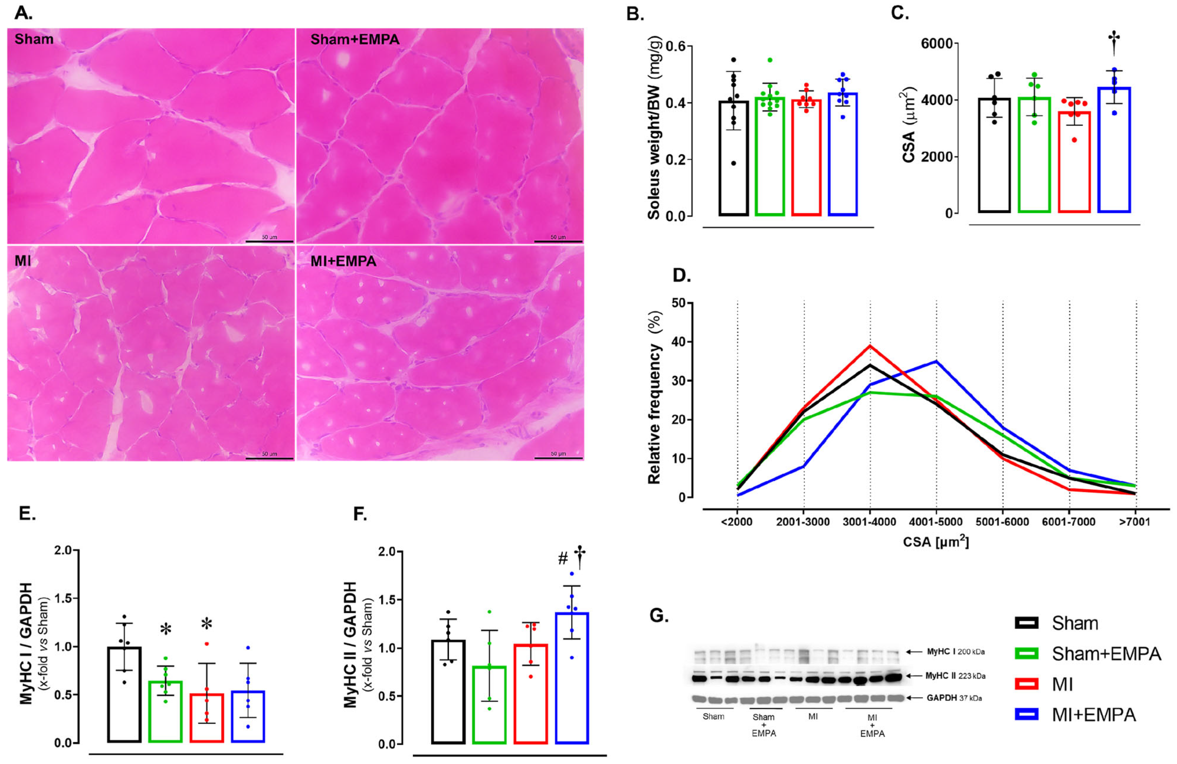 In this study, EMPA had a modest effect on improving infarction-induced cardiac remodeling and no effect on LV function. This allowed us to evaluate its effects on skeletal muscle under similar LV function. EMPA primarily acts by inhibiting SGLT2 channels. Therefore, muscle changes observed in this study were probably caused by drug pleiotropic effects [39]. In MI, the reduction in MyHC I and Complex V, in combination with increased metabolic enzyme activities and oxidative stress, indicates metabolic changes and impaired energy efficacy. However, the fact that FoxO3 was reduced and cross-sectional area preserved, suggests a compensatory mechanism to preserve muscle trophism. By activating the Nrf-2/Keap-1 Complex, EMPA reduced oxidative stress and increased antioxidant defense. In MI + EMPA, metabolic enzyme activities, oxidative stress, and Complex V were normalized, and Complex I increased, showing a protective metabolic effect of EMPA. Furthermore, our data suggest that the increased MyHC II and cross-sectional area was caused by IGF-1 and mTOR stimulation and MAFbx down-regulation. Although the soleus is a predominant oxidative muscle, EMPA was protective, as Type II fibers are more susceptible to atrophic stimulus. These results show the potential of EMPA in preserving muscle mass and function. The reduction in MyHC I in the Sham + EMPA group was not combined with increased oxidative stress or metabolic and morphological changes. This isolated finding deserves future studies to be clarified.