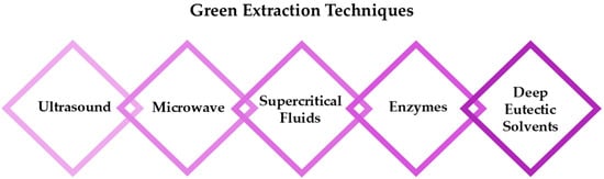 The selection of an appropriate extraction technique is crucial as it directly influences the chemical stability, functionality, and potential toxicity of RSV, in addition to environmental considerations such as energy consumption, heat generation, and waste production []. While traditional extraction methods, such as liquid extraction, percolation, and organic solvent extraction, continue to be widely employed, considerable advancements have been made to improve these techniques through modern technologies (Figure 2) [,,]. Innovations like ultrasound-assisted extraction (UAE), microwave-assisted extraction (MAE), and supercritical fluid extraction (SFE) have demonstrated superior efficiency, reduced solvent consumption, and better preservation of bioactive compounds. Additionally, enzymatic extraction has gained attention as a promising alternative due to its high selectivity, increased recovery rates, and gentle processing conditions. Recently, the use of deep eutectic solvents (DES) [,] as eco-friendly substitutes for traditional solvents has emerged as a promising approach, further enhancing the efficiency and sustainability of resveratrol (RSV) recovery.