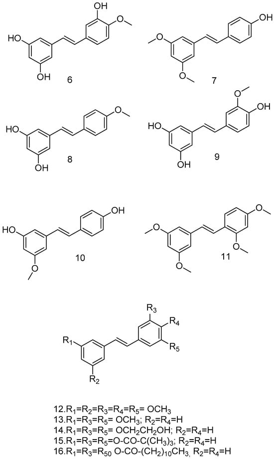 Experimental data suggest that methoxylated RSV analogs pinostilbene (10), pterostilbene (7), which also inhibits replication of the SARSCoV-2 virus in vitro, and tetra methoxystilbene (TMS) (11) (Figure 4) are more potent antitumor agents than the parent compound. In particular, TMS (11) was not only found to be a selective antiproliferative agent against the malignant MCF-7 cell line but also a chemopreventive agent in non-malignant breast cells [].