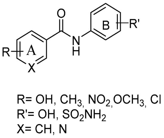 With the aim of synthesizing elective COX-2 inhibitors as a reliable alternative to tNSAIDs, several amide RSV derivatives were prepared (Figure 6), starting from a general structure, including the amide moiety as substituted by the ethylenic linker, and adding a sulfonamide group at nucleus B—key features of potent coxib compounds. Condensation via acyl chloride activated reagent or acetone, and HATU and Et3N, afforded the final amides. The compound with an o-diphenol hydroxyl group in ring A showed a mild selective and a highly potent inhibitory effect on the COX-2 enzyme (COX-2 IC50 = 0.42 μM; SI = 83) without any gastric ulceration. A molecular docking study showed that the o-diphenol hydroxyphenyl moiety could penetrate deep into the COX-2 side pocket and form hydrogen bonds with Gln 192, Ile 517, and Phe 518 [].