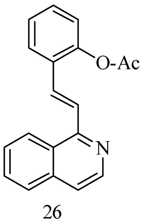 Bearing in mind that the polyhydroxy and arylethylene motifs of RSV are key to its bioactivity, a series of new anticancer RSV 1-styrene–isoquinoline derivatives have been synthesized to maintain proper water solubility by replacing the resorcinol ring with an isoquinoline motif, which has the ability to enhance water solubility due to the presence of a nitrogen atom. Isoquinoline is also found in a large number of natural products with anticancer properties. The compounds were obtained via intermolecular nucleophilic addition of isoquinoline and a suitably substituted aldehyde (Figure 7). The best compound obtained, the 1-OAc substitute 26, showed significant antiproliferative activity to Hun7 and SK-Hep-1 cells (2.52 μM and 4.20 μM, respectively) [].