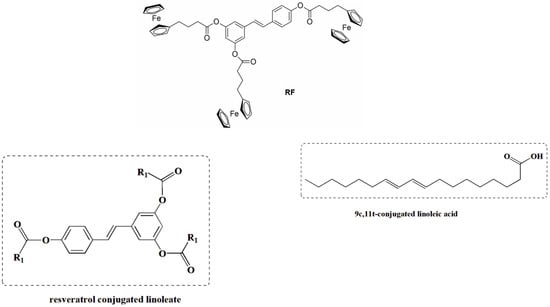 Ferrocene-containing triacyl derivative of resveratrol, RF, and resveratrol-conjugated linoleate.