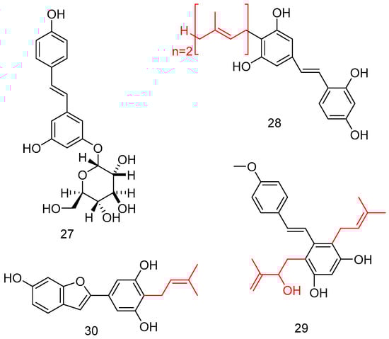 Interestingly, prenylated stilbenoids, despite several being naturally occurring, were difficult to extract; in this case, has been performed several enzymatic reactions to obtain compounds like 28–30, endowing potent α-glucosidase inhibitory activity (Figure 11) [].