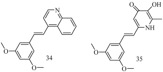 Ischemic stroke is a neurological disorder that often results in significant disability or mortality. RSV has been recognized for its potent neuroprotective properties, but its clinical application is limited by low oral bioavailability and instability. (E)-4-(3,5-dimethoxystyryl) quinoline (34) is an RSV derivative featuring a structural modification that substitutes RSV’s 3,5-dihydroxyl groups with 3,5-dimethoxy groups and its phenolic group with a quinolinyl moiety. Compound 34 was shown to inhibit neuronal apoptosis, attenuate oxidative stress, and enhance mitochondrial function []. The deferiprone–resveratrol hybrid (35) (Figure 13) 2-(3,5-dihy droxystyryl)-5-hydroxy-1-ethylpyridin-4(1 H)-one is chemically synthesized by combining deferiprone (DFP) and resveratrol (RsV) and shows an iron-chelating property along with antioxidant activity, which useful to reduce the high amount of iron in β-thalassemia patients that leads to oxidative stress and organ dysfunction [].