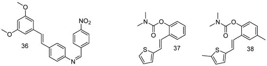 In order to improve the bioavailability of RSV through the modification of hydroxy groups, among all synthesized compounds, a substantial chemical modification afforded surrogates of RSV, such as the resulting compound 36 (Figure 14), which is a promising therapeutic agent against Alzheimer’s disease [].
