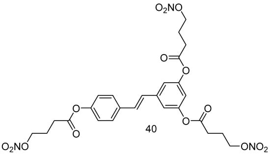 Giuseppe Guglielmini et al., in 2024, aimed to synthesize and characterize a new nitro derivative of resveratrol, trinitroresveratrol (40) (Figure 16), for its potential nitric oxide-donating and antiplatelet effects []. The synthesis of the reported compound was performed under condensation conditions starting from 4-bromo-butanoic acid in dry DCM at 0 °C, DCC/DMAPP, and RSV.