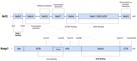 Functional NRF2 and KEAP1 proteins domains. On the top, NRF2 is a 605 amino acid protein that consists of seven functional domains (Neh1–Neh7), each of which leads to the modulation of both NRF2 transcriptional activity and protein stability. KEAP1-binding region is located within the amino-terminal Neh2 domain that contains Asp-Leu-Gly (DLG) and Glu-Thr-Gly-Glu (ETGE) motifs. The β-transducin repeat-containing protein (β-TRCP) interaction occurs in the Neh6 domain. The binding to sMAF (small musculoaponeurotic fibrosarcoma) transcription factors takes place through the Neh1 domain. This interaction affects Cap ‘n’ Collar basic leucine zipper (CNC-bZIP) motif, which is responsible for mediating the binding of AREs (antioxidant response elements). The figure includes the functional roles from Neh1 to Neh7 domains. On the bottom, five domains represent the structure of the KEAP1 protein (624 amino acids residues): Ntr (the N-terminal region), Broad complex, Tramtrack, and Bric-a-brac (BTB), intervening region (IVR), double glycine repeat (DGR) that consists of six kelch repeats, which is involved in the binding sites that interact with NRF2 (Kelch), CTR (C-terminal region). The BTB and IVR domains are involved in Cullin 3 (CUL3) binding, leading to the formation of E3 ubiquitin ligase complex. A dashed line indicates the KEAP1 stress-sensing function by linking the three regions that define the H2O2 stress sensor center (Created with BioRender.com, Licensing and Agreement number EZ285EVYX5, accessed on 15 April 2025).