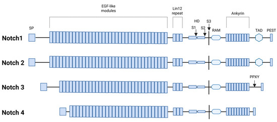 Functional domains of human NOTCH1-4 proteins: signal peptide (SP), epidermal growth factor-like repeats (EGF), LIN-12 repeat (LNR) as receptors for intercellular signals, heterodimerization domain (HD), S1/S2/S3 proteolytic cleavage sites, RBP-Jkappa-associated module (RAM), transcriptional activation domain (TAD), and the polypeptide sequence rich in proline (P), glutamic acid (E), serine (S), and threonine (T) residues. Additionally, the NOTCH3 receptor contains a proline-rich Pro-Pro-x-Tyr (PPXY) motif that serves as a recognition site for the WW domain-containing protein 2 (WWP2), an endocytic regulatory protein (Created with BioRender.com, Licensing and Agreement number RY285EXIU5, accessed on 15 April 2025).