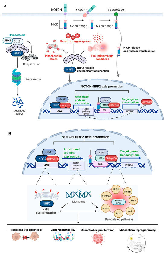 Physiopathological NRF2–NOTCH axis overview. General overview of the NRF2–NOTCH axis, highlighting the main factors and protein complexes involved in the activation of both pathways. (A) Under homeostatic conditions, KEAP1 directs NRF2 towards ubiquitination and subsequent degradation via the proteasome complex. During stress conditions—often linked to altered energy metabolism, mitochondrial dysfunction, and accumulation of ROS, which amplify pro-inflammatory signals—KEAP1 undergoes conformational changes that allow NRF2 to translocate into the nucleus, where it functions as a transcription factor by binding to AREs to initiate a cytoprotective response. Similarly, under physiological conditions, the NOTCH pathway regulates normal development and cell differentiation, thereby contributing to cellular homeostasis. Upon ligand binding, the NOTCH receptor undergoes a series of proteolytic cleavages, culminating in cleavage by γ-secretase, which releases the NICD. NICD then translocates to the nucleus, where it acts as a transcriptional regulator of specific target genes. NICD can interact with the promoter of the NFE2L2 gene to stimulate NRF2 transcription, or it can cooperate with transcriptional co-activators such as CBP/p300 to enhance the transcriptional activity of NRF2 on its target genes. Conversely, NRF2 can upregulate components of the NOTCH pathway by binding to AREs located in the promoters of various genes, including those involved in NOTCH signaling, thereby promoting their expression. Beyond these direct mechanisms, the interconnection between the NOTCH and NRF2 pathways is part of a much broader and more intricate signaling network, with multiple intermediate pathways activated by both axes (Created with BioRender.com, Licensing and Agreement number YR285EY4B1, accessed on 15 April 2025). (B) Mutations or dysregulation within the NRF2–NOTCH axis can lead to aberrant and dysfunctional activation. In cancer, hyperactivation of NRF2—often triggered by persistent stress signals—can be exploited by tumor cells to survive hostile conditions and may in turn contribute to increased NOTCH signaling. Likewise, deregulated NOTCH activity can either upregulate or fail to appropriately activate NRF2. Beyond their oncogenic potential, the deregulation of NOTCH and NRF2 activities can affect a multitude of downstream effectors, such as HIF-1, NF-κB, ER-α, AKT, PI3K, mTORC2, and β-catenin. The deregulation of these interconnected pathways facilitates the acquisition of a set of cancer hallmarks as well as resistance to apoptosis, genomic instability, uncontrolled proliferation, and metabolic reprogramming. The biological complexity of NRF2–NOTCH axis defines its ability to rewire multiple tumor-promoting networks, fueling cancer development and progression (Created with BioRender.com, Licensing and Agreement number ST285EYE6Y, accessed on 15 April 2025). Abbreviations: KEAP1, Kelch-like ECH-associated protein 1; NRF2, Nuclear factor erythroid 2-related factor 2; Cul3, Cullin 3; RBX1, RING-box protein 1; Ub, Ubiquitin; NOTCH, Neurogenic Locus NOTCH Homolog; ADAM10, A Disintegrin And Metalloprotease 10; NICD, NOTCH Intracellular Domain; sMAF, Small Musculoaponeurotic Fibrosarcoma oncogene homologs; CBP/p300, CREB-binding protein/E1A-binding protein p300; ARE, Antioxidant Response Element; Co-A, Co-Activator; MAM, Mastermind-like protein; CSL, CBF-1/suppressor of hairless/Lag1; ROS, Reactive Oxygen Species; HIF-1, Hypoxia-Inducible Factor 1; NF-κB, Nuclear Factor kappa-light-chain-enhancer of activated B cells; ER-α, Estrogen Receptor alpha; Akt, Protein Kinase B; PI3K, Phosphoinositide 3-Kinase; mTORC2, Mechanistic Target of Rapamycin Complex 2; β-Catenin, Beta-Catenin.