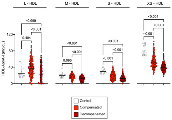 HDL subclass concentrations across study groups. Baseline concentrations of HDL-ApoA-I subclasses in healthy controls, compensated cirrhosis, and decompensated cirrhosis. Concentrations in compensated cirrhosis are represented in light red, decompensated cirrhosis in dark red, and healthy controls in white. The graphs show all data points, with the line representing the median of each data set. Statistical significance was assessed using the Kruskal–Wallis test with Dunn’s multiple comparisons post hoc analysis. Abbreviations: ApoA-I, apolipoprotein A-I; HDL, high-density lipoprotein; L-, large; M-, medium; S-, small; XS-, extra-small.