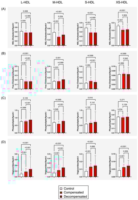 HDL Subclass composition across study groups. HDL lipid subclass measurements were normalized to corresponding ApoA-I subclass levels to assess compositional differences in lipid content across L- to XS-HDL particles. (A) HDL-total cholesterol (free and esterified) content in L-HDL to XS-HDL particles in healthy controls and patients with compensated or decompensated cirrhosis. (B) HDL-free cholesterol levels across HDL subclasses. (C) HDL-phospholipid content in HDL particles. (D) HDL-triglyceride levels in L-HDL to XS-HDL particles. Error bars indicate the standard deviation of the mean. Statistical significance was evaluated using the Kruskal–Wallis test followed by Dunn’s multiple comparisons post hoc analysis. Abbreviations: ApoA-I, apolipoprotein A-I; HDL, high-density lipoprotein; L-, large; M-, medium; S-, small; XS-, extra-small.