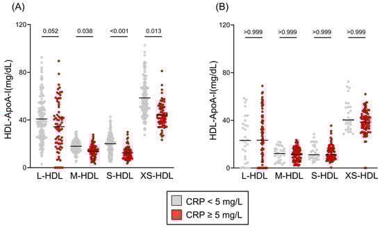 HDL subclass distribution by inflammation status. HDL subclass distributions are presented as Tukey’s box plots, comparing patients with C-reactive protein (CRP) levels <5 mg/L (gray) and ≥5 mg/L (red). Distributions are shown for (A) compensated cirrhosis and (B) decompensated cirrhosis. Statistical differences were determined using the Kruskal–Wallis test with Dunn’s multiple comparisons post hoc analysis. Abbreviations: ApoA-I, apolipoprotein A-I; HDL, high-density lipoprotein; L-, large; M-, medium; S-, small; XS-, extra-small.