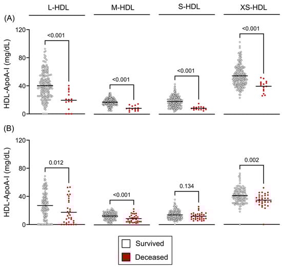 HDL subclass concentrations and survival outcomes. (A) Twelve-month survivors versus non-survivors in compensated cirrhosis and (B) ninety-day survivors versus non-survivors in decompensated cirrhosis. Statistical significance was assessed using unpaired t-tests or Mann–Whitney U tests, as appropriate based on data distribution. Abbreviations: ApoA-I, apolipoprotein A-I; HDL, high-density lipoprotein; L-, large; M-, medium; S-, small; XS-, extra-small.