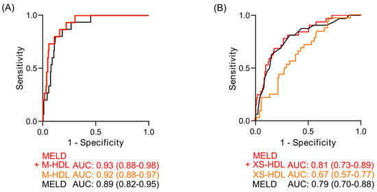 To assess clinical utility, receiver operating characteristic (ROC) analyses were performed on significant Cox regression predictors. In compensated cirrhosis, M-HDL had a numerically higher area under the curve (AUC) than MELD for predicting 12-month mortality (0.92 vs. 0.89; Figure 6A). The combination of M-HDL-ApoA-I and MELD further improved prognostic accuracy (AUC: 0.93). In decompensated cirrhosis, although XS-HDL-ApoA-I was a significant predictor in Cox regression, it did not significantly improve the 90-day mortality prediction of MELD (Figure 6B). Although the ROC curves of combined MELD and M- HDL or combined MELD and XS-HDL showed comparable or slightly higher AUC than the MELD score alone, statistical comparison using the DeLong test revealed no significant differences between the AUCs of the MELD score and those combined parameters (compensated: p = 0.612, decompensated: p = 0.818).