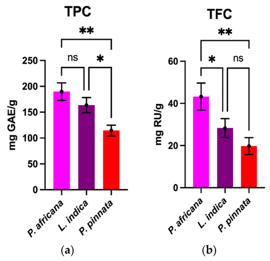 TPC and TFC determined in the sample extracts are graphically shown in Figure 1. The TPC value obtained in this study in P.africana bark was 189.0 ± 16.93 mg GAE/g, which was higher than the reports in previous studies (12.20 to 69.2 mg GAE/g) [54,55,56]. The TPC value of L. indica leaves in this study was 163.6 ± 14.73 mg GAE/g, which is in-between the results (65.20–240.0 mg GAE/g) in previous studies [52,57]. However, the TPC value of P. pinata leaves obtained in this study was 114.6 ± 10.38 mg GAE/g, which is lower than the results (150 mg GAE/g) in a previous study [53], but higher than the 33.4 mg tannic acid equivalent/g reported in a different study [33]. The findings obtained in this study demonstrate that P. africana bark contained the highest TPC, followed by L. indica and P. pinnata leaves.