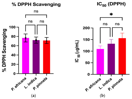 The percentage of yield for P. africana bark extract was 11.9%, which was in-between the results (24.45% and 8.13%) from the studies in P. africana leaves [50,51]. The result in L. indica leaves in this study was 11.1%, which was slightly higher than those in a previous study (5.3–7.81%) using different solvents [52]. The percentage of yield for P. pinnata leaves in this study was 10.8%, which is slightly higher than those from a study (8.31% and 8%) in ethanol and aqueous methanol extracts [31,53].