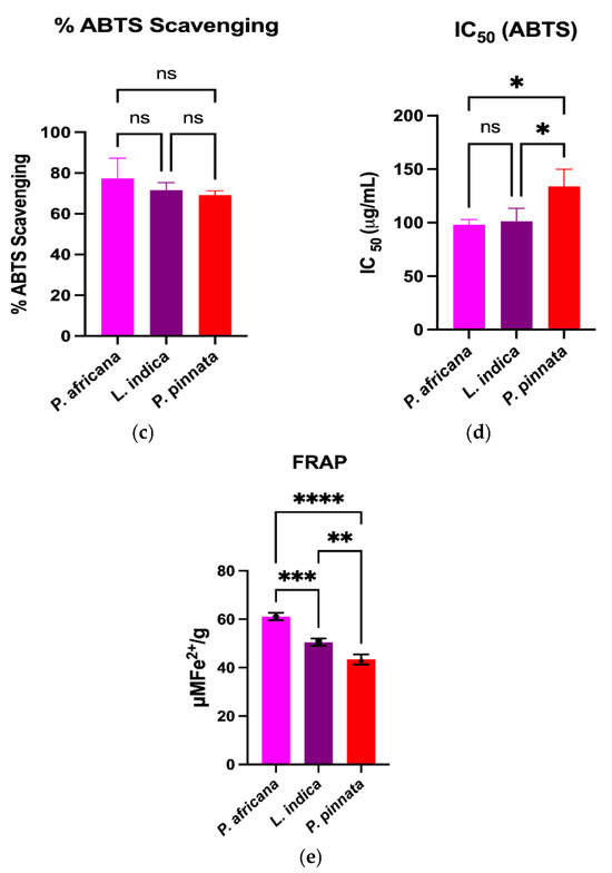 Comparison of antioxidant activities among plant extracts. Results are expressed as mean ± SD (n = 3). One-way ANOVA with error bars representing standard deviation differences, where * p < 0.05, ** p < 0.01, *** p < 0.001, and **** p < 0.0001 were considered as significant; ns: not significant.