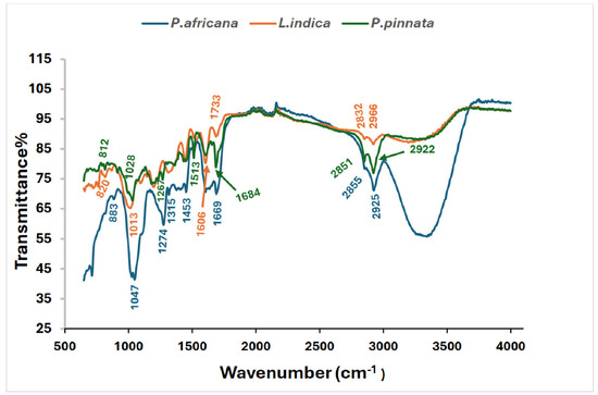 All the potential bands labeled with wave numbers and possible functional groups are shown in Table 2 and Figure 3. P. africana bark extract showed the characteristic absorption bands at 887, 1025, 1047, 1274, 1315, 1513, 1688, 2855, and 2925 cm−1, representing C=C, C–N/F C–O, C–H, C=O, C–H, N–H, and O–H functional groups, with the corresponding possible bioactive phytochemicals shown in Table 2. Similar functional groups were reported in P. africana bark extract in a previous study [62]. In the extract of L. indica leaves, the presence of C=C, C–N/F C–O, C–H, C=O, C–H, N–H, and O–H functional groups found in this study was comparable with those reported in a previous study [69]. The absorption bands at 820, 1028, 1241, 1375, 1438, 1513, 1606, 1990, 2851, and 2922 cm−1 detected in P. pinnata leaf extract, representing the corresponding functional groups, were also closer to the results for P. pinnata leaves in a previous study [31].