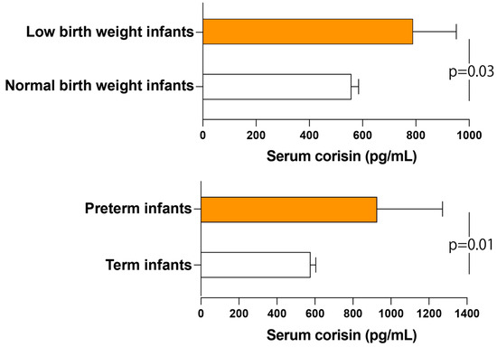 In the present study, serum corisin levels were significantly elevated in pregnant women who experienced preterm birth or delivered low-birth-weight infants compared with controls. Corisin levels also showed significant correlations with birth weight, birth length, myeloperoxidase (a marker of oxidative stress), and markers of coagulation activation, suggesting a potential association between elevated corisin and adverse fetal outcomes.