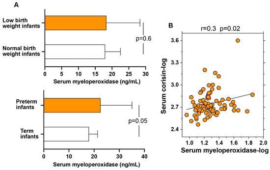Elevated serum levels of myeloperoxidase in women delivering preterm infants and significant correlation between the serum levels of myeloperoxidase and corisin in all patients. (A,B) Myeloperoxidase and corisin levels were measured using enzyme immunoassays as described in the Materials and Methods section. Measurements were conducted in patients delivering infants with a birth weight of less than 2.5 kg (n = 22) or greater than 2.5 kg (n = 62) pre-term (n = 10) or term (n = 74) newborns. Data are presented as median with the interquartile range. Statistical analysis was performed using the Mann–Whitney U test.