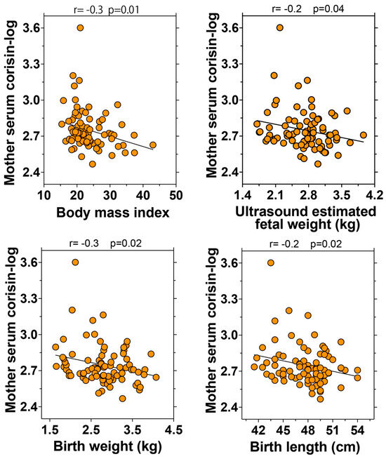 The potential clinical relevance of corisin was assessed by analyzing its relationship with prenatal and perinatal data across all patients. Serum corisin levels demonstrated a significant inverse correlation with the ultrasound-estimated fetal weight (p = 0.04), birth weight (p = 0.02), and birth height (p = 0.02) (Figure 3). Additionally, serum corisin levels showed an inverse correlation with gestational age and the 1 min Apgar score, although these associations did not reach statistical significance (Figure S3). Notably, serum corisin levels were also significantly and inversely correlated with maternal BMI (p = 0.01), and this relationship remained robust even after excluding individuals with a BMI greater than 35.