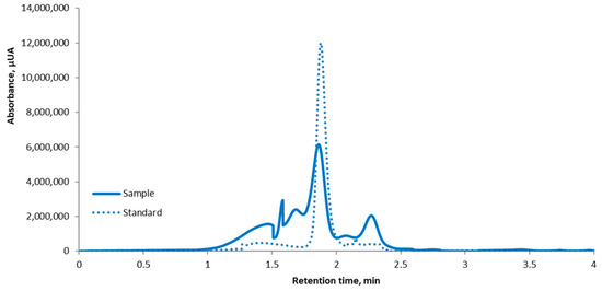 A preliminary High-Performance Liquid Chromatography (HPLC) analysis was also presented in our previous study [26], which showed that beetroot skin had a distinct peak at a retention time of 1.87 ± 0.2 min. Additionally, our findings (Figure 1) concur with those of earlier studies by Kujala et al. [40] and Rotich et al. [41]. According to the findings, betanin is the principal component that may be found in significant quantities in the peels and pomace of B. vulgaris L. The content of betanin in beetroot powder extract was 8.2 mg/g dw. The findings are supported by Prieto-Santiago et al. [42], who established that the total betanin content in red beet varied from 2.50 to 8.50 mg/g dw. Rotich et al. [41] detected an average of 3.81 ± 0.30 mg/g of betanin in B. vulgaris L. pomace from fruit juice sellers in Eldoret, Kenya, by the Soxhlet extraction method followed by HPLC-UV analysis.